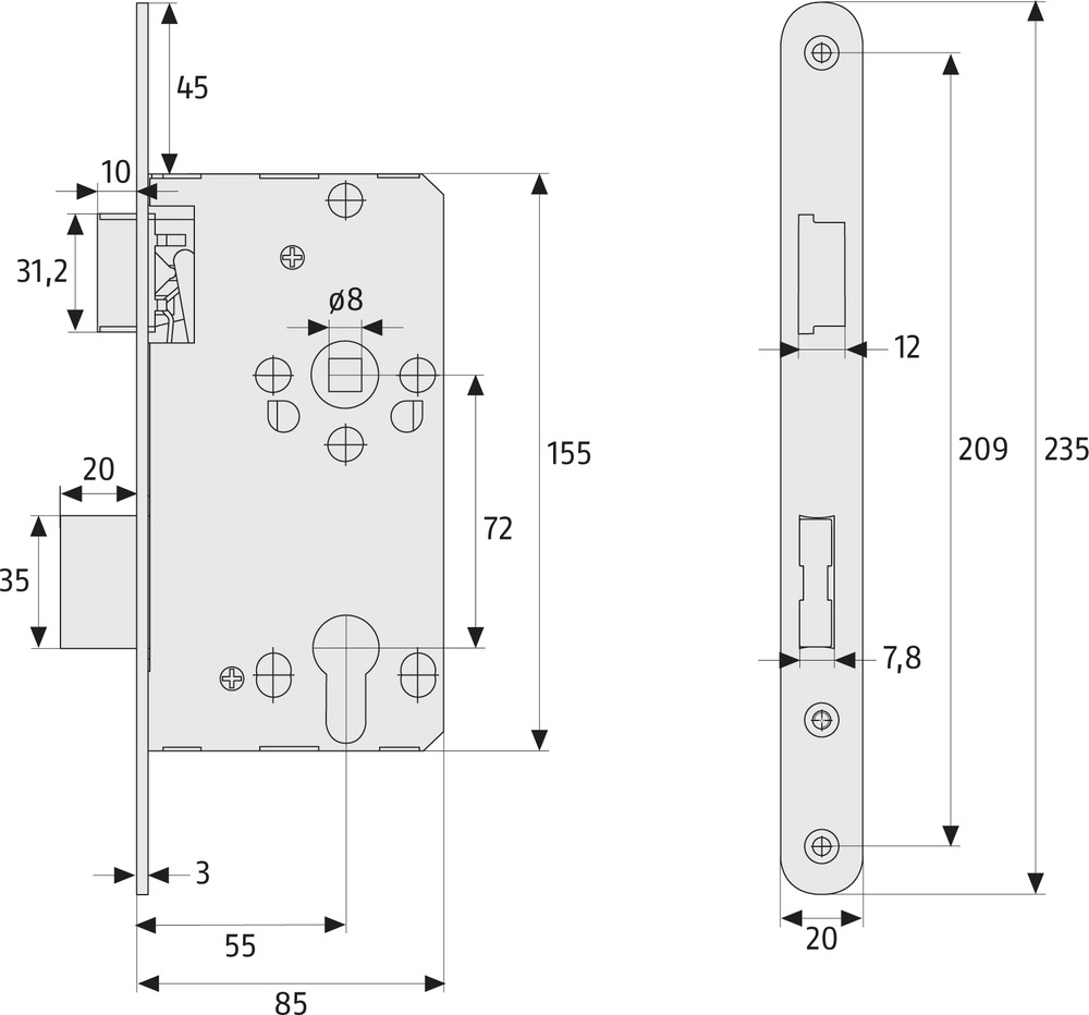 You can reliably lock your flat entrance doors with corridor fittings using the mortice lock. In use, it impresses with its special wear resistance and corrosion protection.